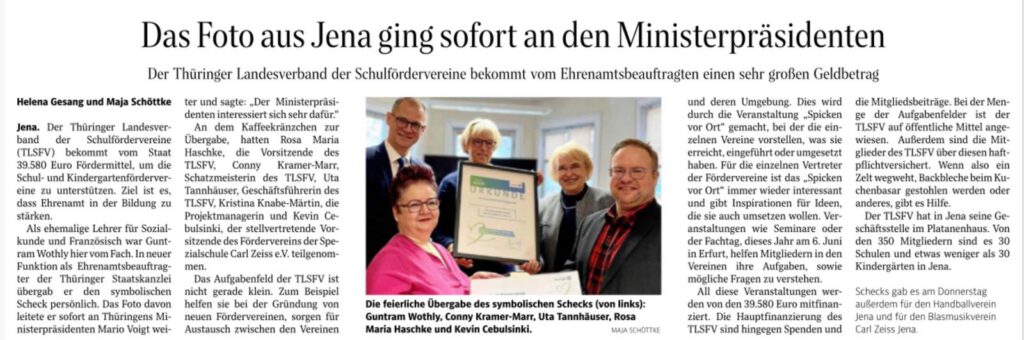 Am 5. Februar besuchte der Thüringer Ehrenamtsbeauftragte Guntram Wothly die Geschäftsstelle des Landesverbandes in Jena. Anlass war die Scheckübergabe für eine Förderung des TLSFV in Höhe von 39.580,00 Euro im Rahmen des Thüringer Landesprogramms zur Stärkung des Ehrenamts.