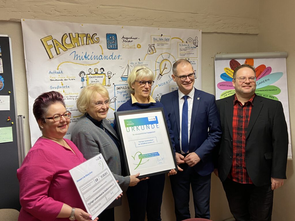 Am 5. Februar besuchte der Thüringer Ehrenamtsbeauftragte Guntram Wothly die Geschäftsstelle des Landesverbandes in Jena. Anlass war die Scheckübergabe für eine Förderung des TLSFV in Höhe von 39.580,00 Euro im Rahmen des Thüringer Landesprogramms zur Stärkung des Ehrenamts.