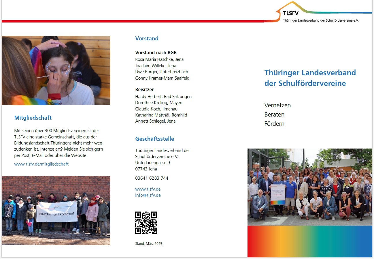 Als Dachverband der Fördervereine an Schulen und Kindergärten in Thüringen ist der TLSFV ein starker Partner im Bildungsbereich. Der Verband wurde im Januar 2008 gegründet und wird von einem zehnköpfigen Vorstand ehrenamtlich geführt. Gemeinsam mit den Ehrenamtlichen in den Mitgliedsvereinen verfolgt der TLSFV ein Ziel: die Bildungschancen für Kinder und Jugendliche an Schulen und Kindergärten durch die Verbesserung der Rahmenbedingungen zu unterstützen und zu stärken.